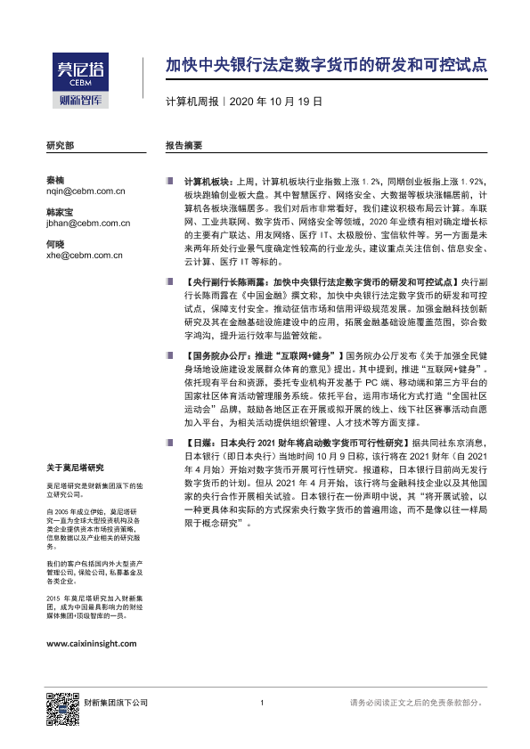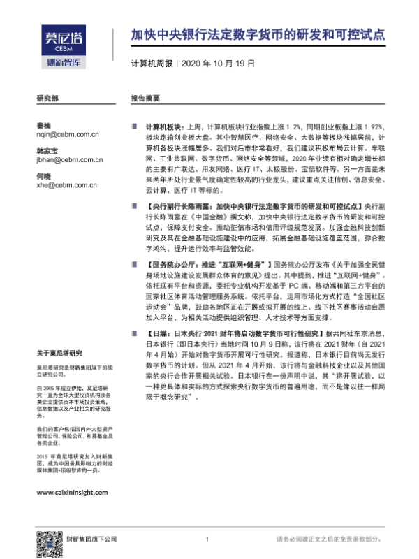 【莫尼塔研究】【20201019】加快中央银行法定数字货币的研发和可控试点-6页