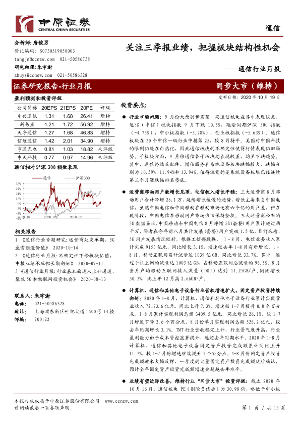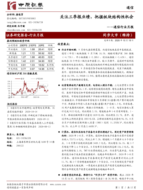 【中原证券】【20201019】通信行业月报:关注三季报业绩,把握板块结构性机会-15页