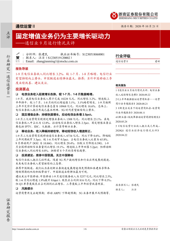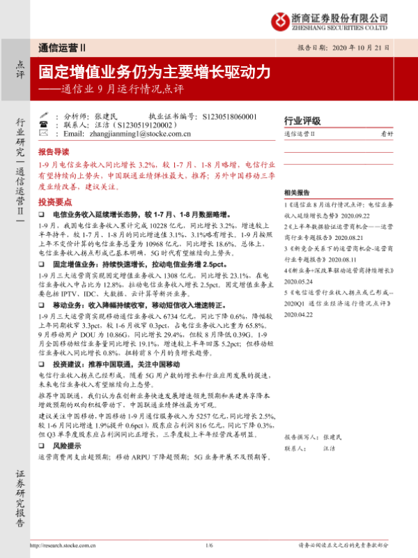 【浙商证券】【20201021】通信业9月运行情况点评:固定增值业务仍为主要增长驱动力-6页