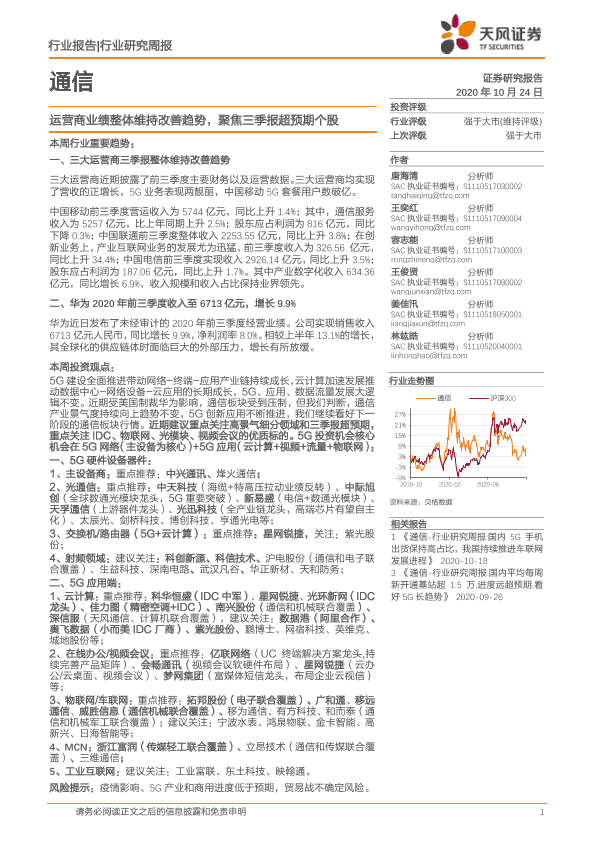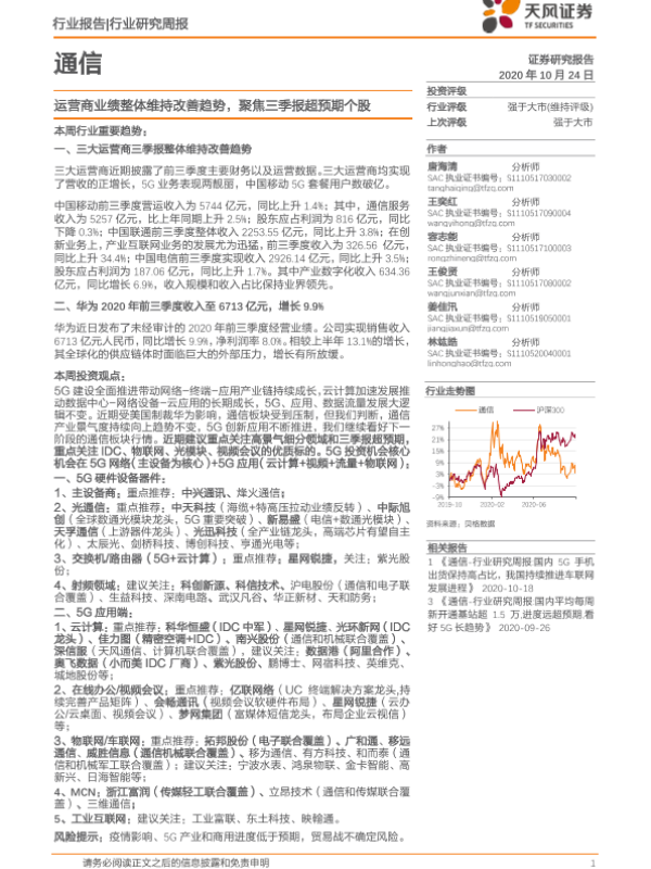 【天风证券】【20201024】通信行业研究周报:运营商业绩整体维持改善趋势,聚焦三季报超预期个股-12页