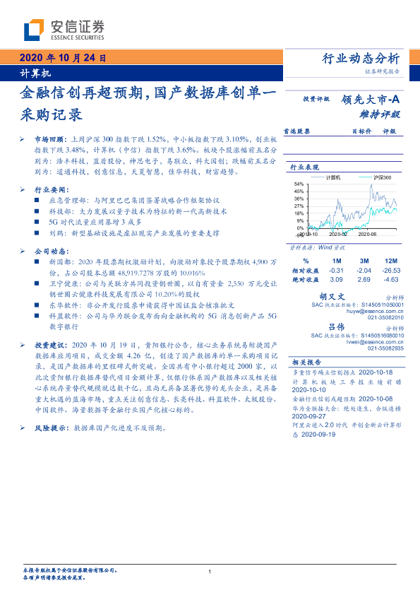 【安信证券】【20201024】计算机行业动态分析:金融信创再超预期,国产数据库创单一采购记录-12页