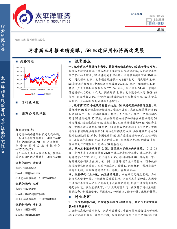 【太平洋证券】【20201025】通信行业周报:运营商三季报业绩亮眼,5G以建促用仍将高速发展-13页