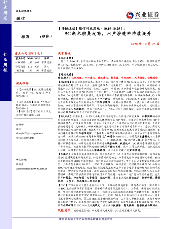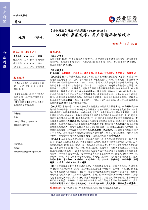 【兴业证券】【20201025】通信行业周报(10.19-10.25):5G新机密集发布,用户渗透率持续提升-7页
