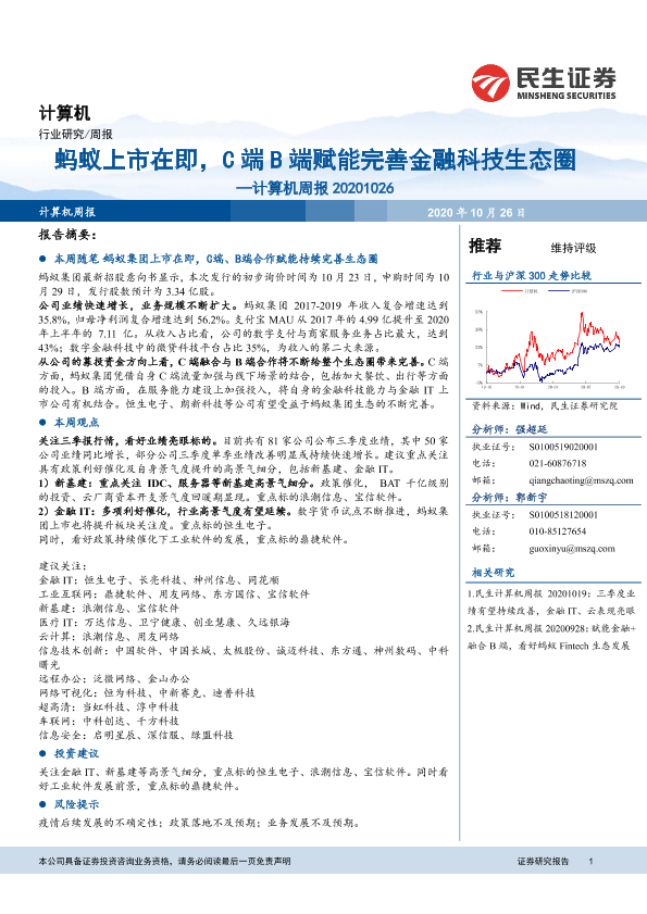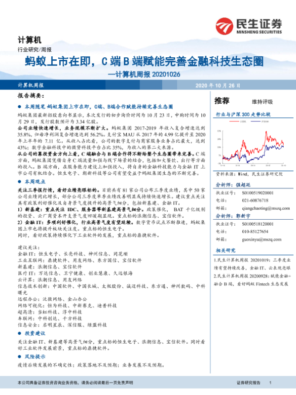 【民生证券】【20201026】20201026-民生证券-计算机周报:蚂蚁上市在即,C端B端赋能完善金融科技生态圈-16页