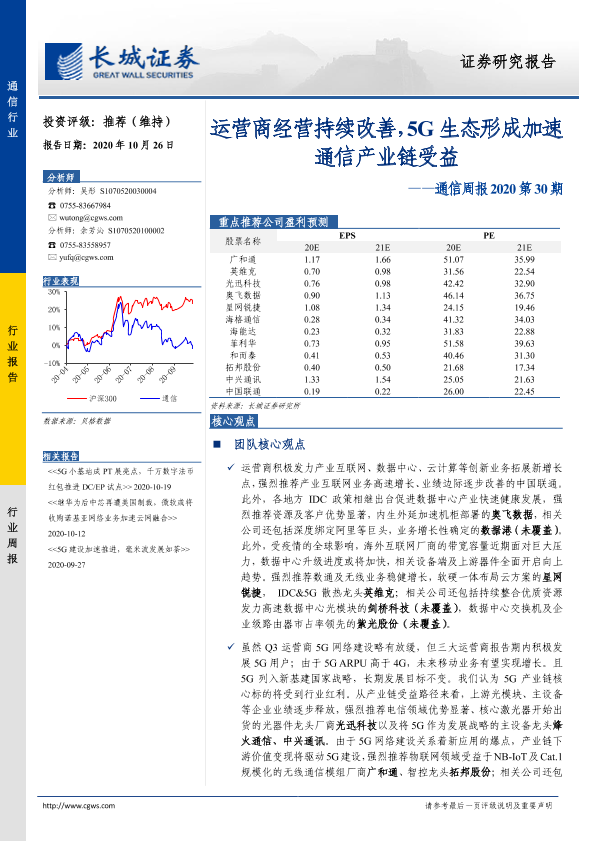 【长城证券】【20201026】通信周报2020第30期:运营商经营持续改善,5G生态形成加速通信产业链受益-23页