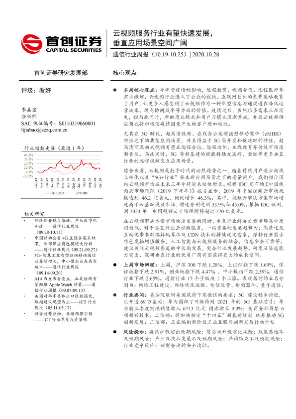 【首创证券】【20201028】通信行业周报:云视频服务行业有望快速发展,垂直应用场景空间广阔-9页