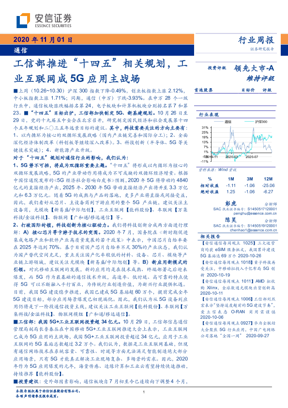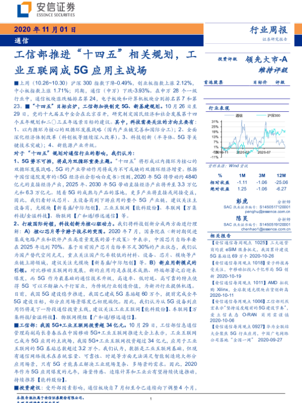 【安信证券】【20201101】通信行业周报:工信部推进“十四五”相关规划,工业互联网成5G应用主战场-14页
