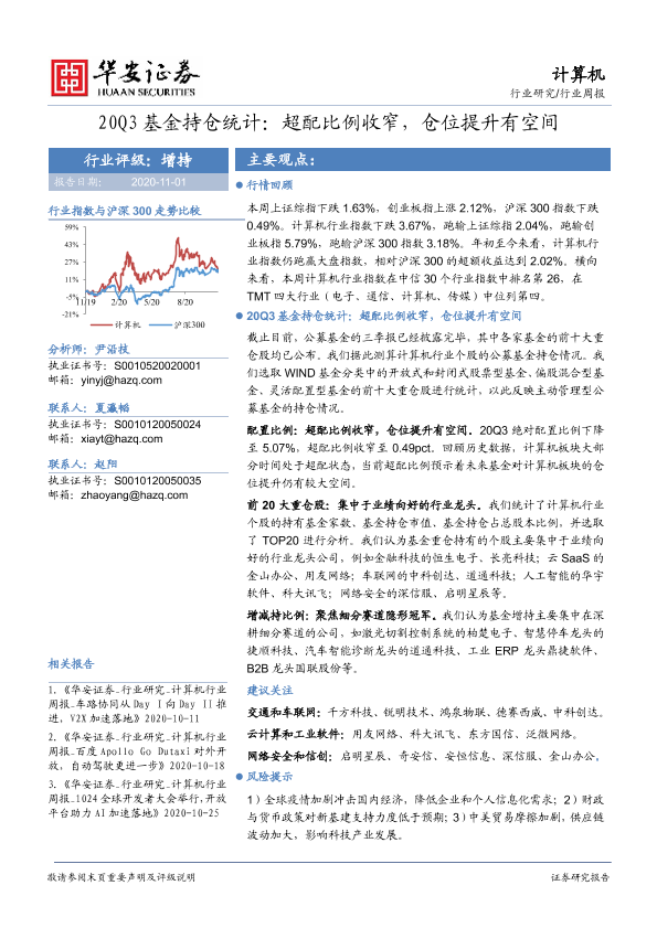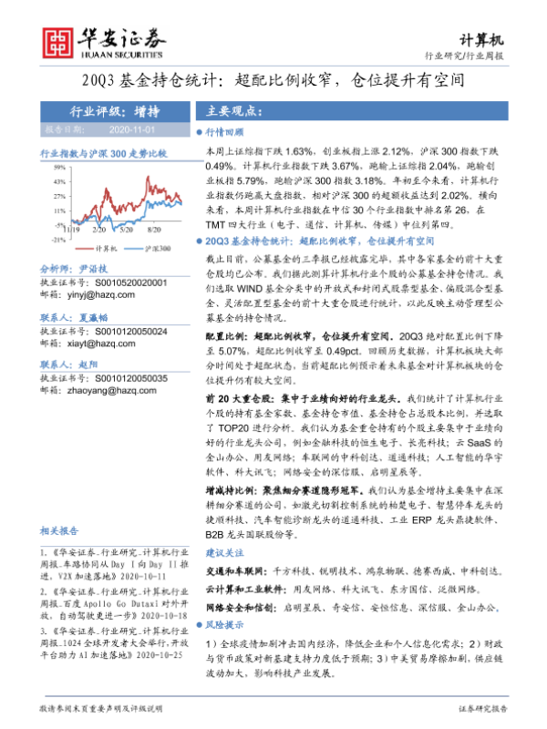 【华安证券】【20201101】20201101-华安证券-计算机行业周报:20Q3基金持仓统计:超配比例收窄,仓位提升有空间-21页