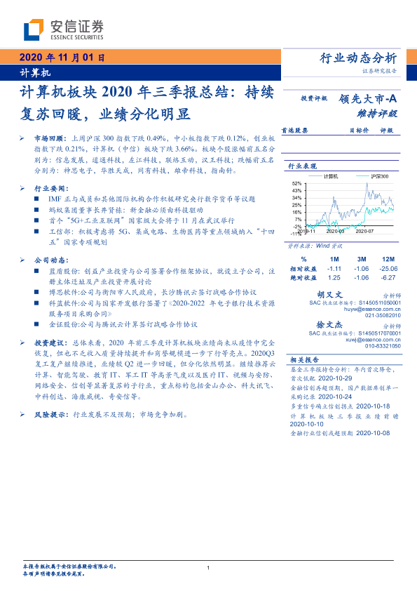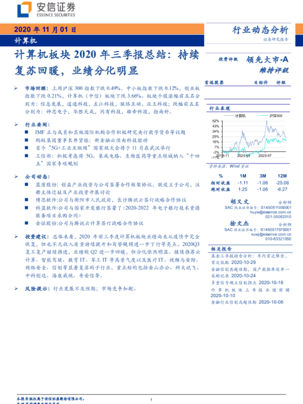 【安信证券】【20201101】计算机板块2020年三季报总结:持续复苏回暖,业绩分化明显-26页