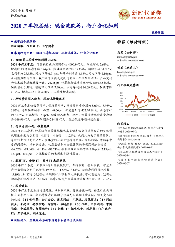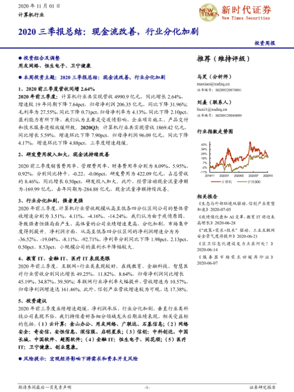 【新时代证券】【20201101】计算机行业2020三季报总结:现金流改善,行业分化加剧-15页