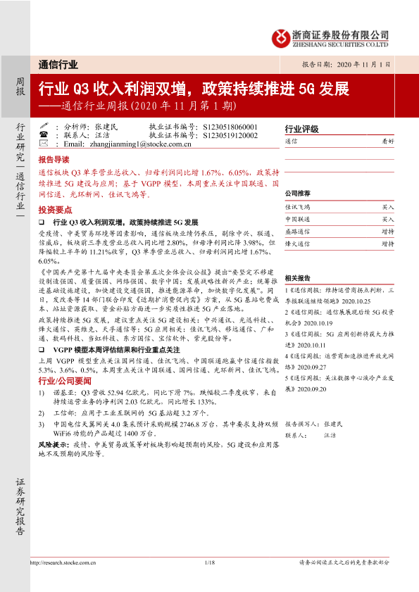 【浙商证券】【20201101】通信行业周报(2020年11月第1期):行业Q3收入利润双增,政策持续推进5G发展-18页