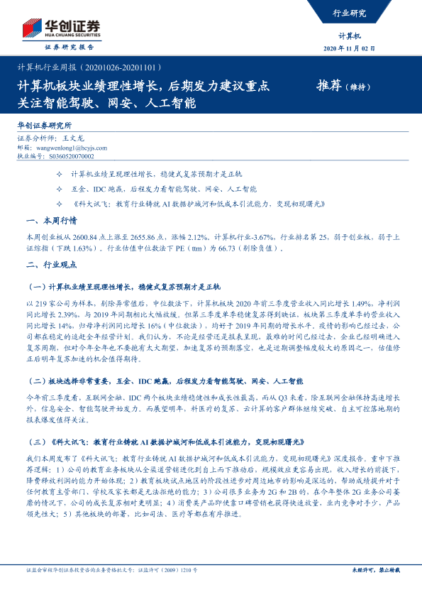 【华创证券】【20201102】计算机行业周报:计算机板块业绩理性增长,后期发力建议重点关注智能驾驶、网安、人工智能-5页