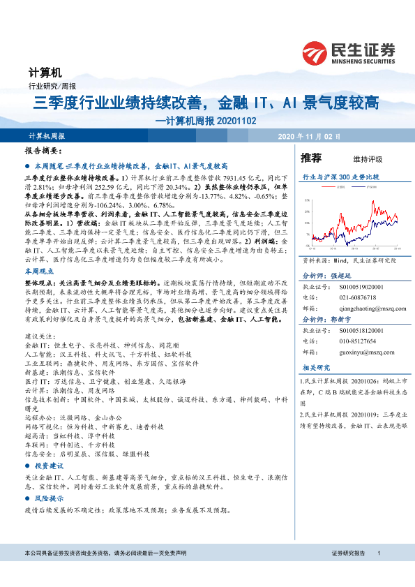 【民生证券】【20201102】20201102-民生证券-计算机周报:三季度行业业绩持续改善,金融IT、AI景气度较高-16页