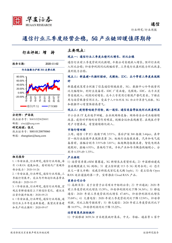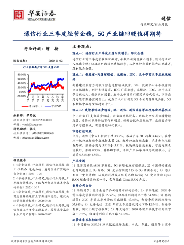 【华安证券】【20201102】通信行业周报:通信行业三季度经营企稳,5G产业链回暖值得期待-20页