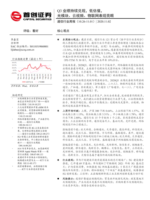 【首创证券】【20201102】20201102-首创证券-通信行业周报:Q3业绩持续兑现,低估值,光模块、云视频、物联网表现亮眼-9页