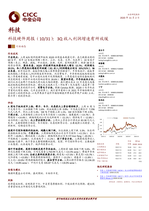 【中金公司】【20201102】科技硬件周报:3Q收入利润增速有所放缓-14页