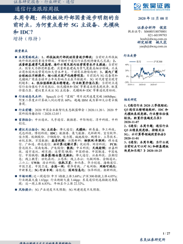 【东吴证券】【20201108】通信行业跟踪周报-本周专题:科技板块外部因素逐步明朗的当前时点,为何重点看好5G主设备、光模块和IDC?-27页