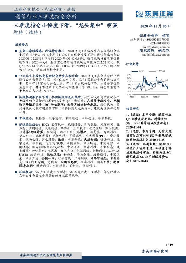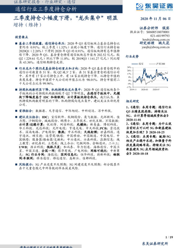 【东吴证券】【20201106】通信行业三季度持仓分析:三季度持仓小幅度下滑,“龙头集中”明显-19页
