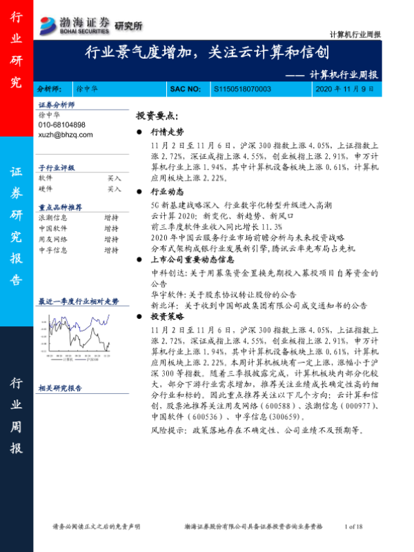 【渤海证券】【20201109】计算机行业周报:行业景气度增加,关注云计算和信创-18页