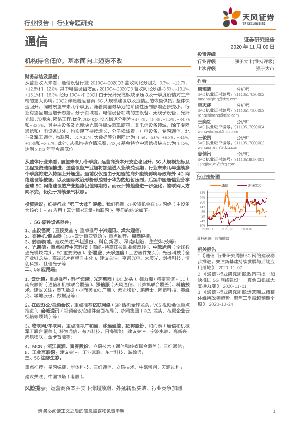 【天风证券】【20201109】通信行业专题研究:机构持仓低位,基本面向上趋势不改-32页