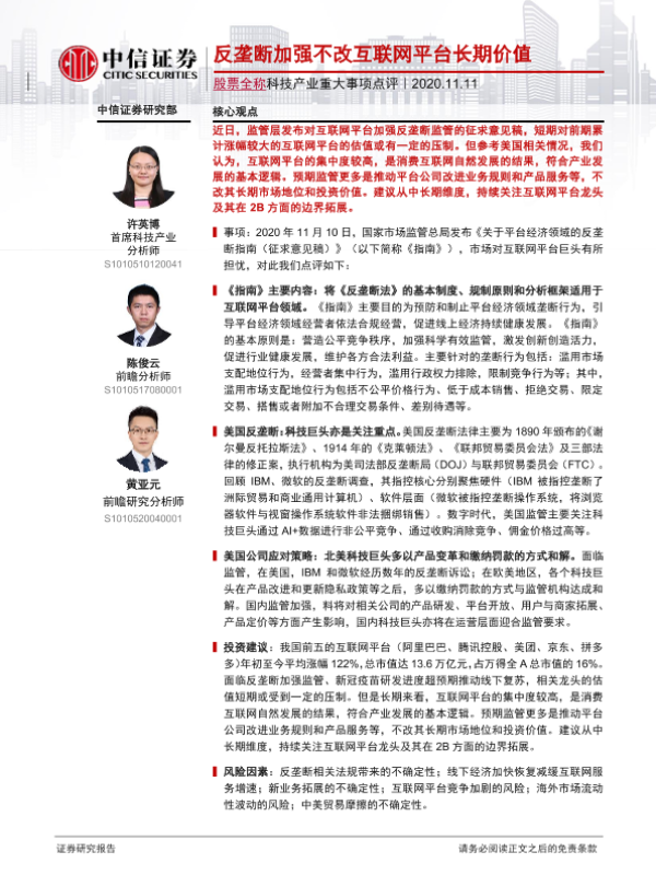 【中信证券】【20201111】科技产业重大事项点评:反垄断加强不改互联网平台长期价值-4页