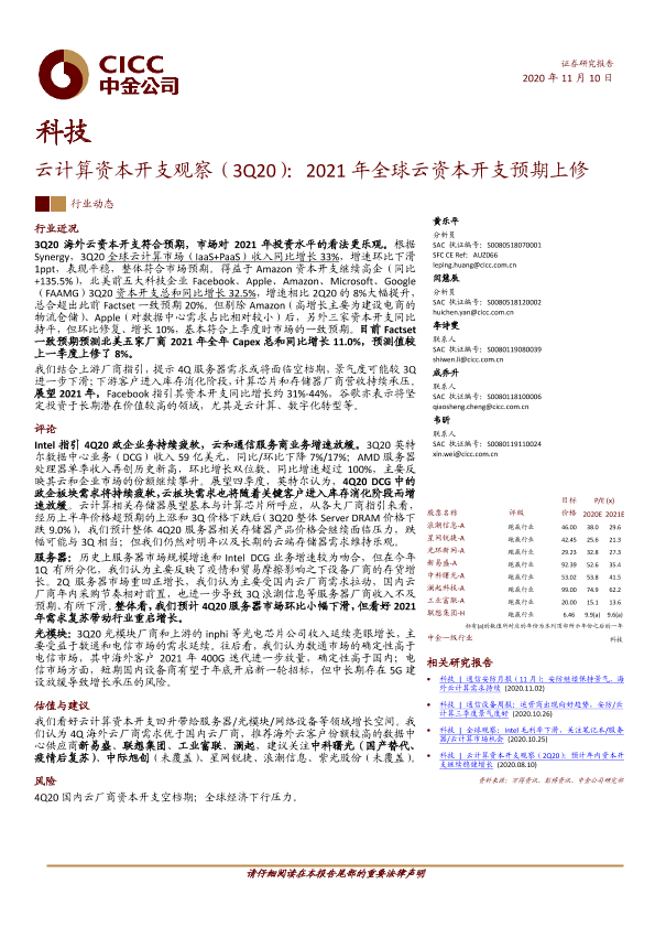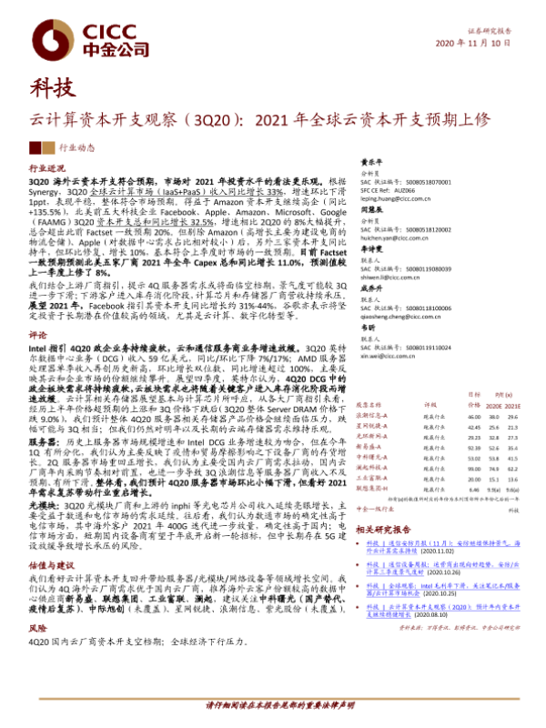 【中金公司】【20201110】科技:云计算资本开支观察(3Q20):2021年全球云资本开支预期上修-13页