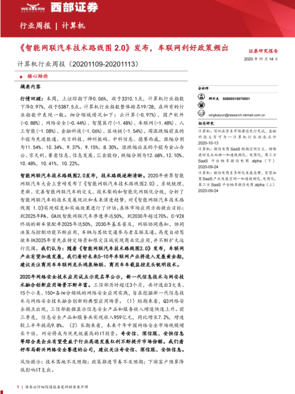 【西部证券】【20201114】20201114-西部证券-计算机行业周报:《智能网联汽车技术路线图2.0》发布,车联网利好政策频出-16页