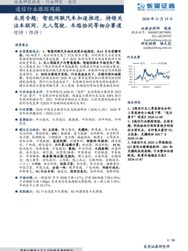 【东吴证券】【20201115】20201115-东吴证券-通信行业跟踪周报:本周专题:智能网联汽车加速推进,持续关注车联网、无人驾驶、车路协同等细分赛道-24页