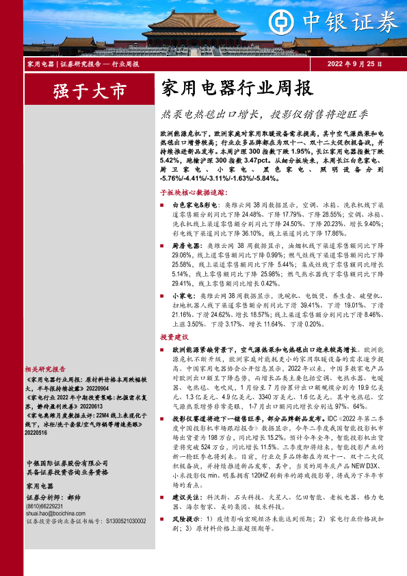 【中银证券】【20220925】家用电器行业周报:热泵电热毯出口增长,投影仪销售将迎旺季-28页