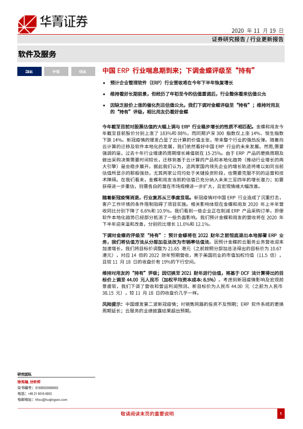 【华兴证券(境内)】【20201119】中国ERP行业喘息期到来;下调金蝶评级至“持有”-6页