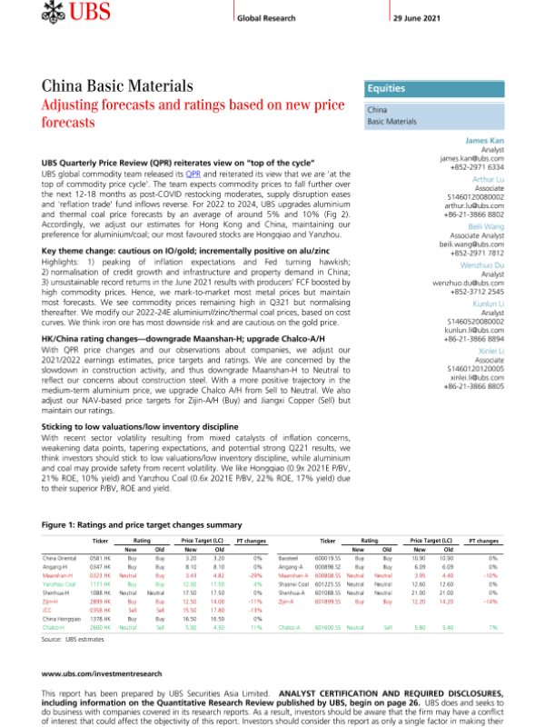 【UBS Securities Asia Limited】【20210629】瑞银-中国原材料行业-根据新的价格预测调整预测和评级-35页
