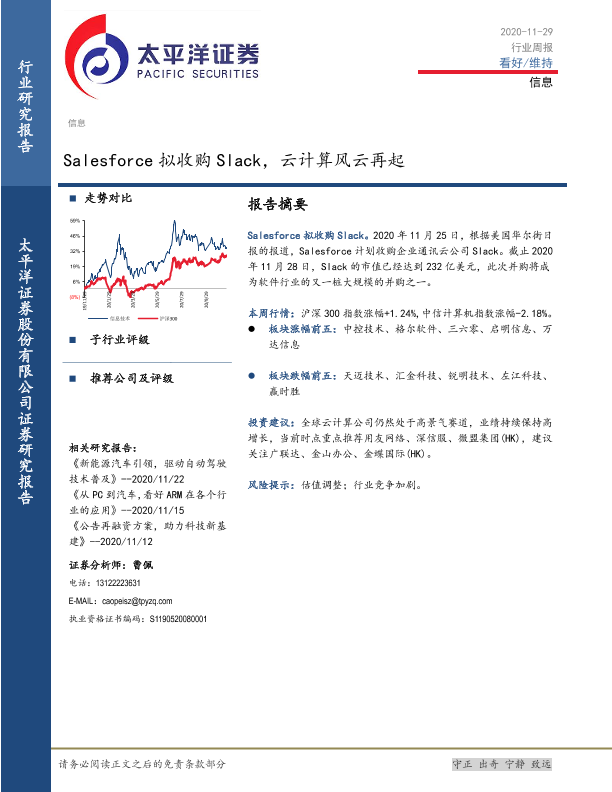 【太平洋证券】【20201129】20201129-太平洋-信息行业周报:Salesforce拟收购Slack,云计算风云再起-14页