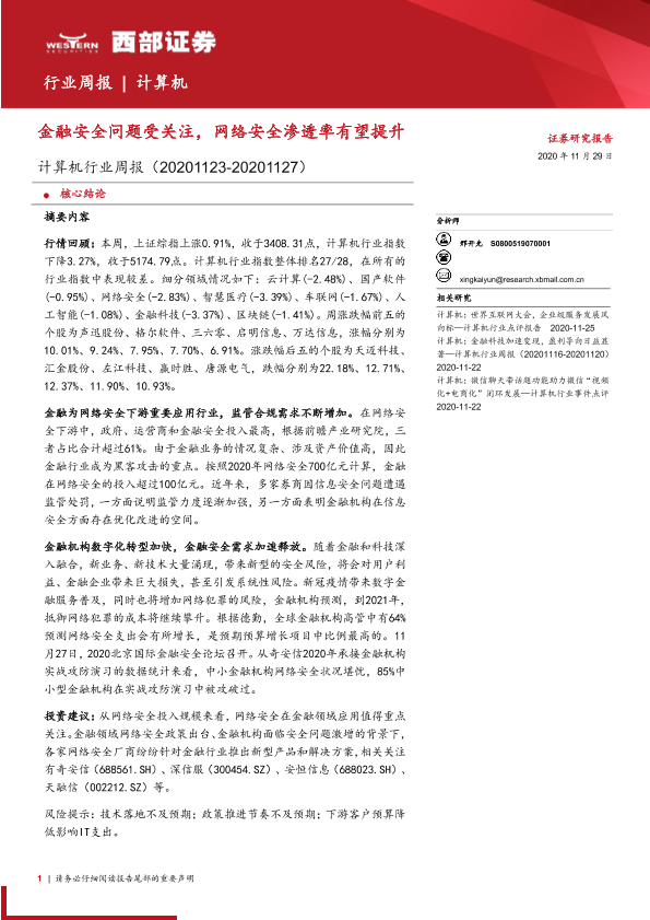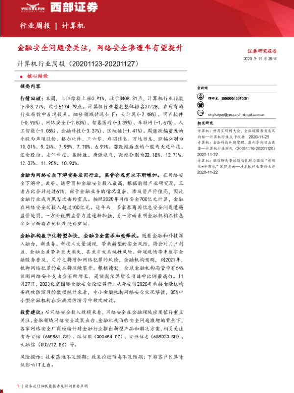 【西部证券】【20201129】计算机行业周报:金融安全问题受关注,网络安全渗透率有望提升-16页