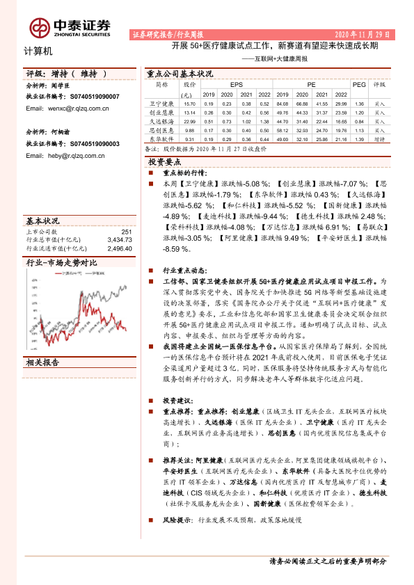 【中泰证券】【20201129】互联网+大健康周报:开展5G+医疗健康试点工作,新赛道有望迎来快速成长期-8页