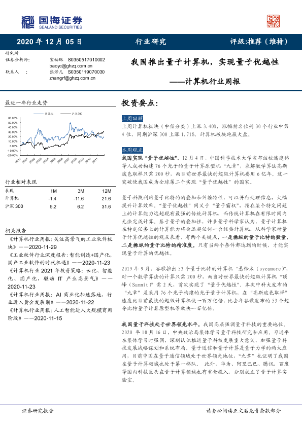 【国海证券】【20201205】20201205-国海证券-计算机行业周报:我国推出量子计算机,实现量子优越性-13页