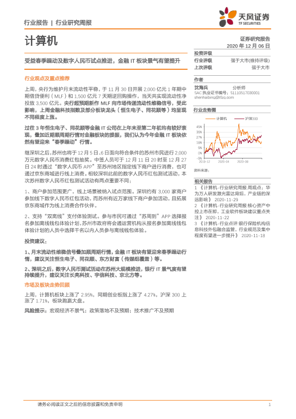 【天风证券】【20201206】计算机行业研究周报:受益春季躁动及数字人民币试点推进,金融IT板块景气有望提升-7页