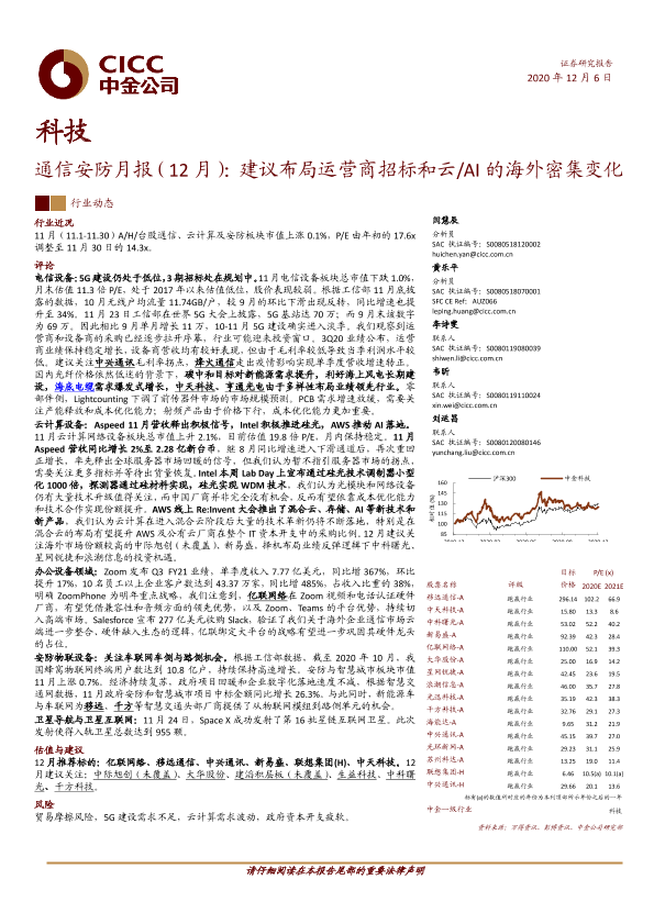 【中金公司】【20201206】科技:通信安防月报(12月):建议布局运营商招标和云 AI的海外密集变化-25页