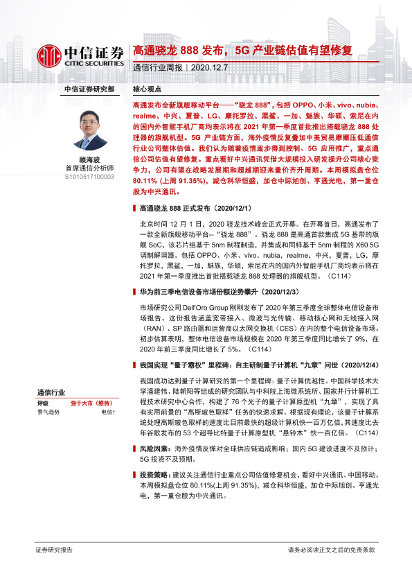 【中信证券】【20201207】20201207-中信证券-通信行业周报:高通骁龙888发布,5G产业链估值有望修复-9页