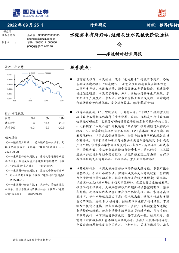 【国海证券】【20220925】建筑材料行业周报:水泥需求有所好转,继续关注水泥板块阶段性机会-22页