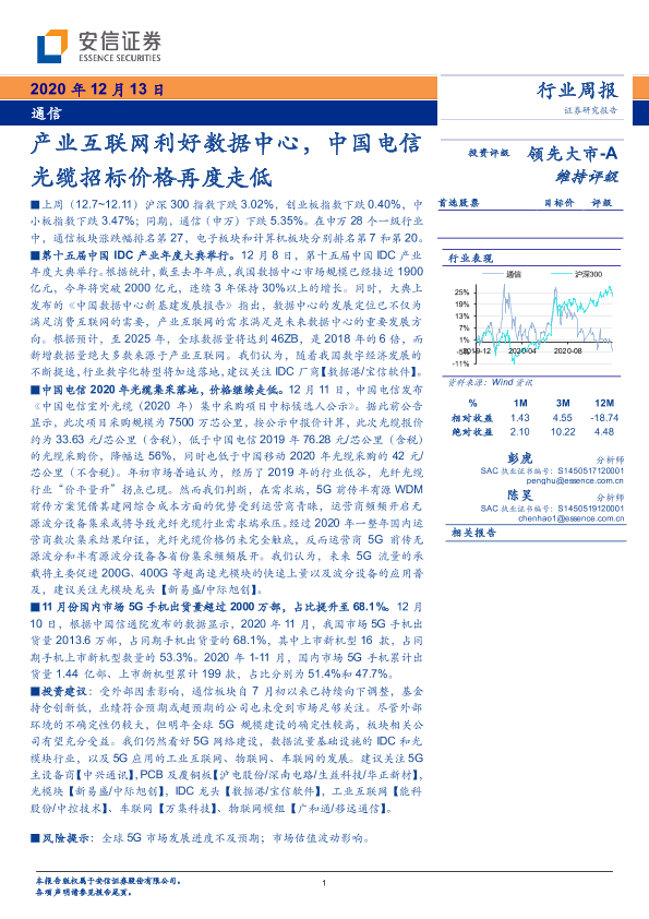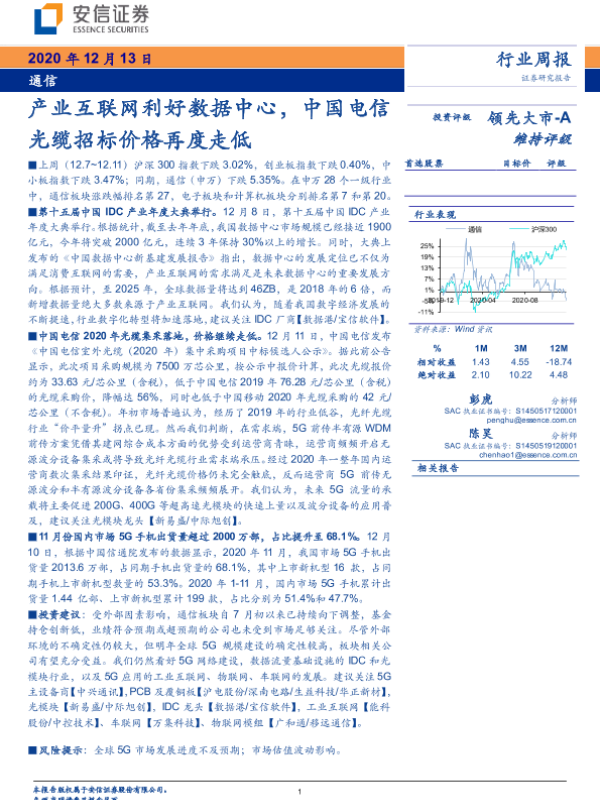 【安信证券】【20201213】通信行业周报:产业互联网利好数据中心,中国电信光缆招标价格再度走低-14页