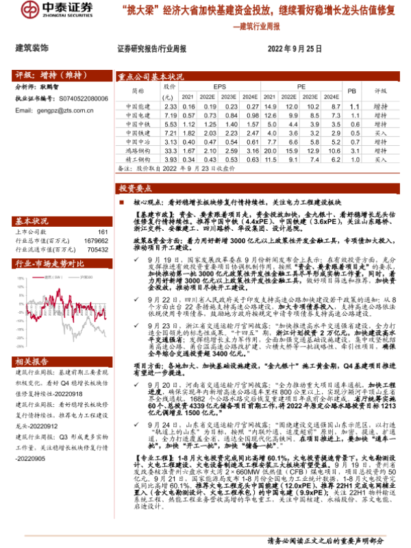 【中泰证券】【20220925】建筑行业周报:“挑大梁”经济大省加快基建资金投放,继续看好稳增长龙头估值修复-20页