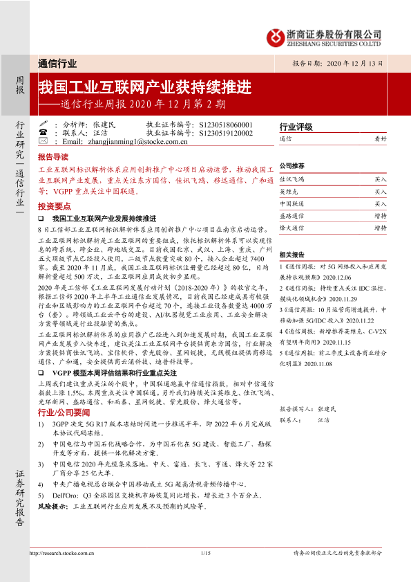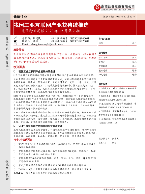 【浙商证券】【20201213】通信行业周报2020年12月第2期:我国工业互联网产业获持续推进-15页