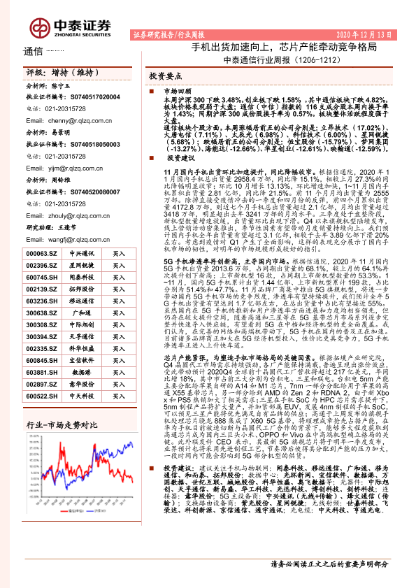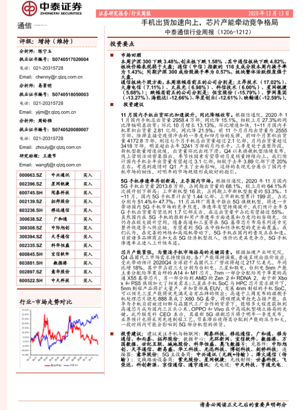 【中泰证券】【20201213】中泰通信行业周报:手机出货加速向上,芯片产能牵动竞争格局-15页