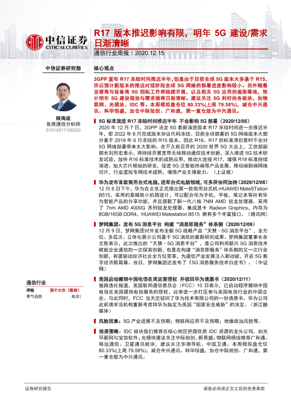 【中信证券】【20201215】20201215-中信证券-通信行业周报:R17版本推迟影响有限,明年5G建设需求日渐清晰-9页