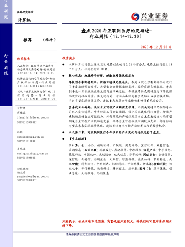 互联网医疗 市场动态 政策分析 行业周报 计算机行业