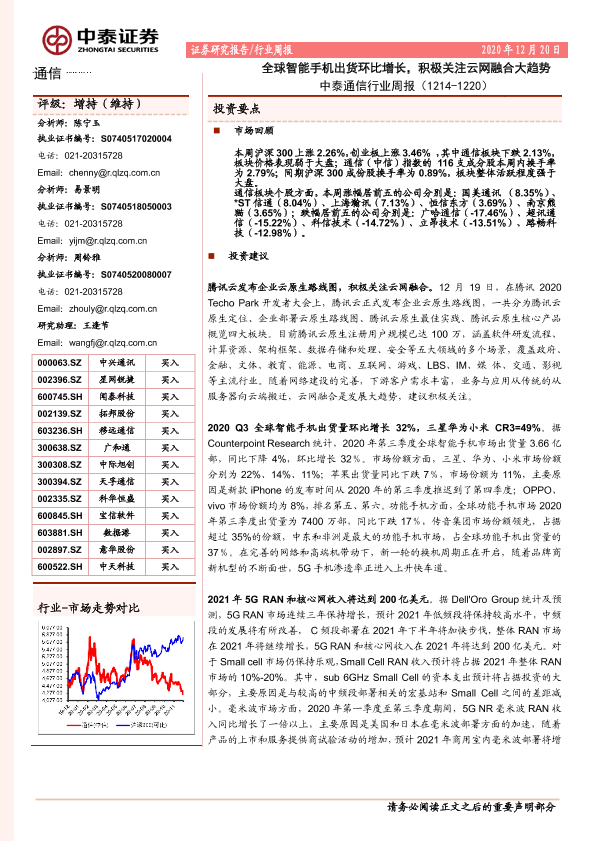 【中泰证券】【20201220】通信行业周报:全球智能手机出货环比增长,积极关注云网融合大趋势-15页