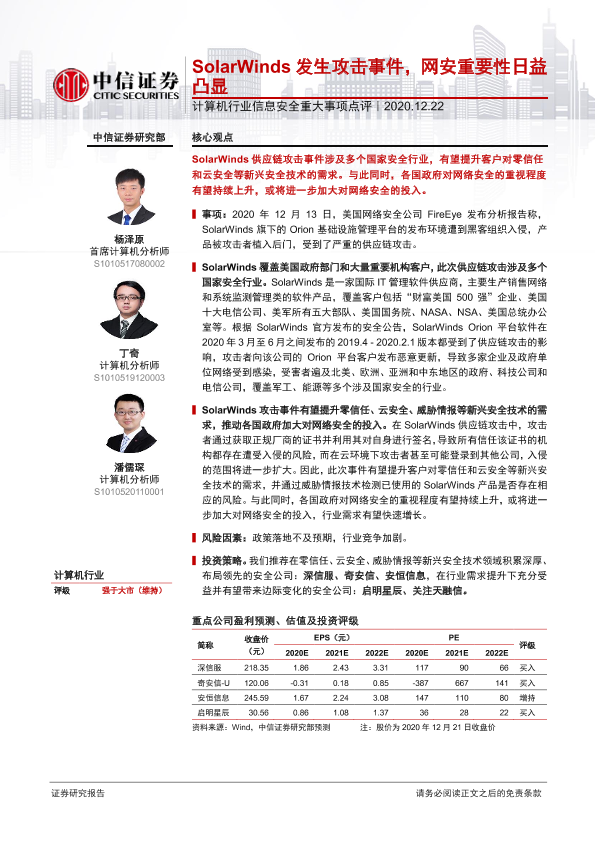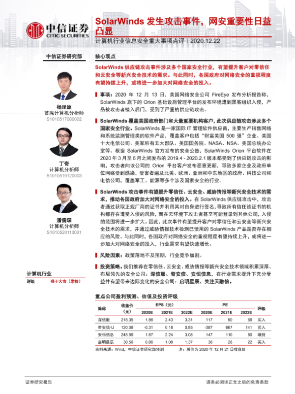 【中信证券】【20201222】计算机行业信息安全重大事项点评:SolarWinds发生攻击事件,网安重要性日益凸显-2页