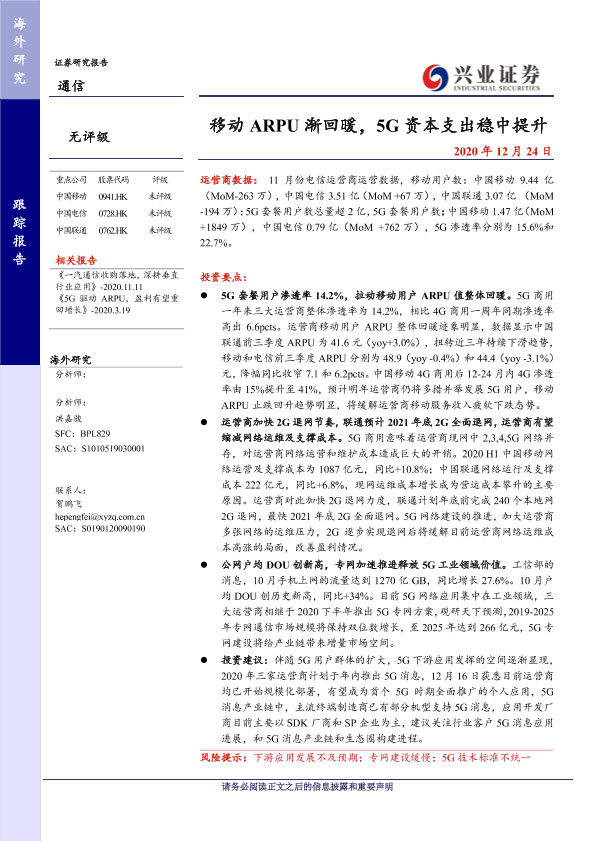 【兴业证券】【20201224】移动 ARPU渐回暖,5G资本支出稳中提升-11页