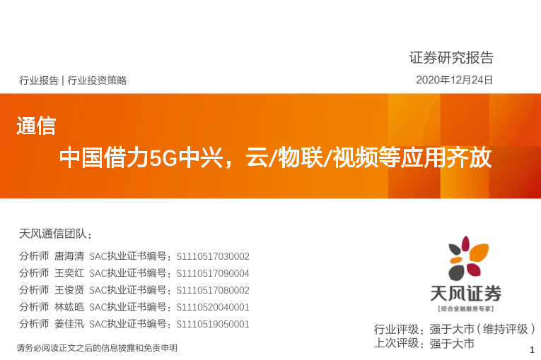 【天风证券】【20201224】通信行业投资策略:中国借力5G中兴,云/物联/视频等应用齐放-100页