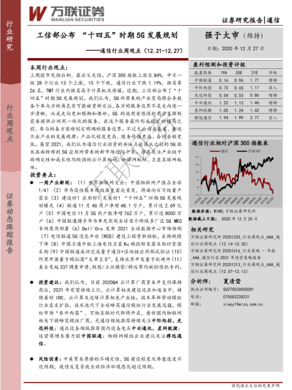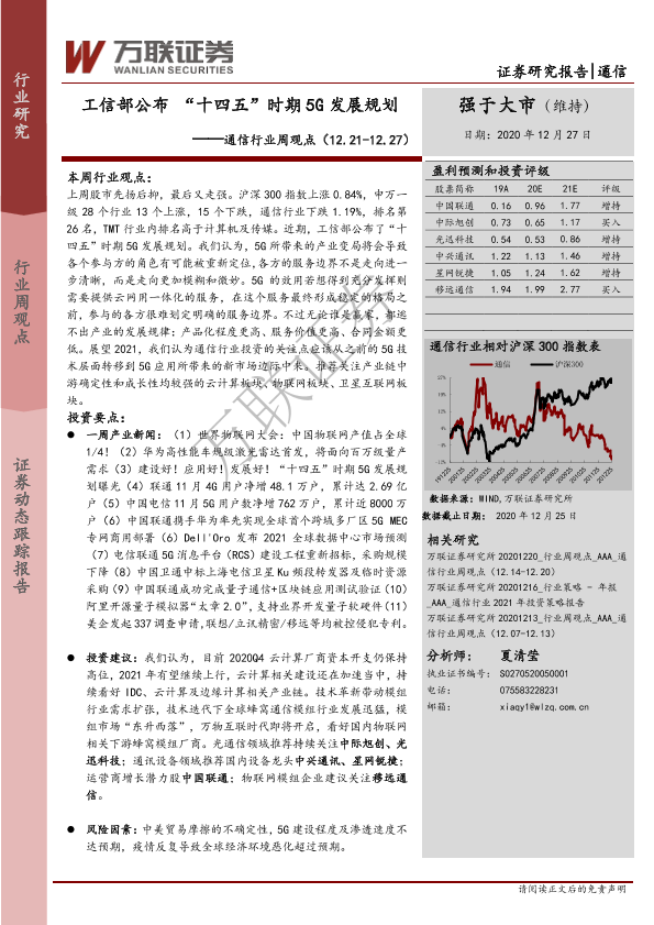 【万联证券】【20201227】20201227-万联证券-通信行业周观点:工信部公布“十四五”时期5G发展规划-16页